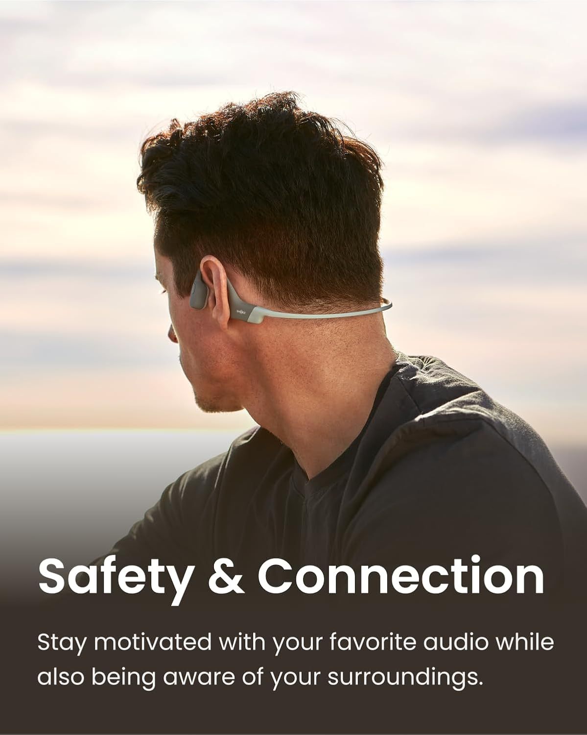 - Conexión de seguridad Manténgase alerta y motivado durante cualquier entrenamiento con nuestra tecnología de conducción ósea de octava generación. OpenRun ofrece audio de calidad y deja sus tímpanos expuestos al entorno para una máxima seguridad.