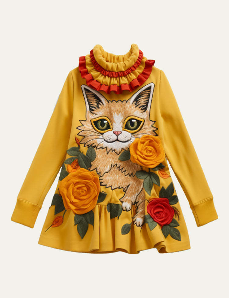 Toddler Girl Petal Neck Cat & Rose Applique Long Sleeves Dress